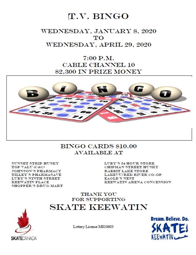Skate Keewatin is doing TV Bingo on Shaw! Beginning January 8 and running every Wednesday until April 29, tune into Kenora's local Shaw channel channel at 7:00pm to play some bingo and maybe win some big money, all while supporting Skate Keewatin.
